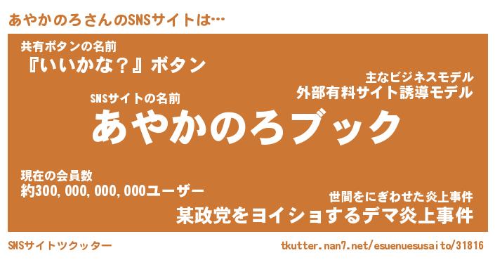 | 肩書あだ名 | 『あやかのろCEO』『あやかのろ国家主席』 |