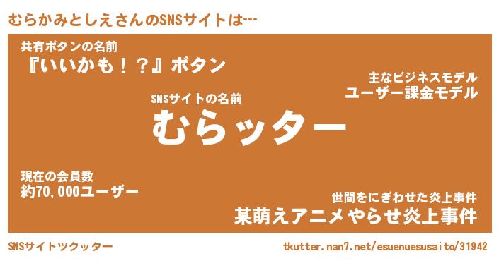 | 肩書あだ名 | 『むらかみとしえ御曹司』 |