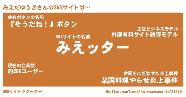 | ツイッター | みえだゆうきさんのツイッターID『fukuyoka_man』 |
