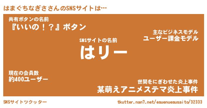 | 男性向けラノベタイトル風あだ名 | 『はまぐちなぎさの憂鬱』 |