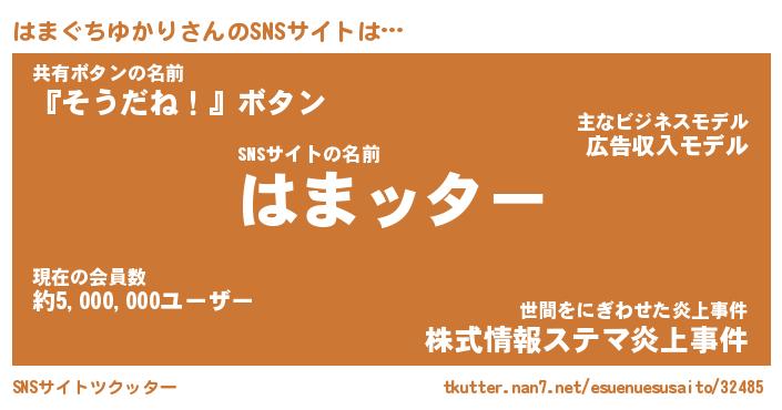 | 男性向けラノベタイトル風あだ名 | 『ハマグチユカリアートオンライン』 |