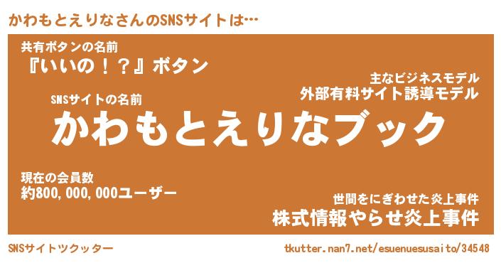 | 女子向けラノベタイトル風あだ名 | 『誰かこのかわもとえりなを説明してください! ~契約から始まるウェディング~』 |