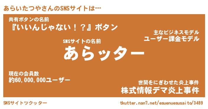 | 胡散臭い通販商品みたいなあだ名 | 『億万長者になれる霊験あらたかなお札…その名も「あらいたつや」』 |