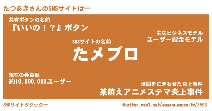 | 意味不明あだ名 | 『ペロリンたつあき』『永久保存たつあき』 |