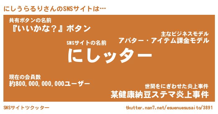 | 胡散臭い通販商品みたいなあだ名 | 『億万長者になれる霊験あらたかなお札…その名も「にしうらるり」』 |