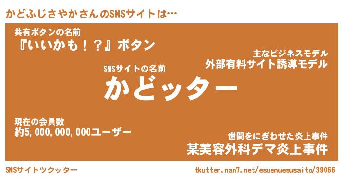 | 男性向けラノベタイトル風あだ名 | 『カドフジサヤカアートオンライン』 |