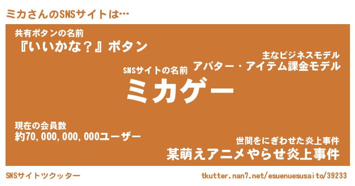 | 肩書あだ名 | 『ミカ社長』『ミカ国家主席』 |
