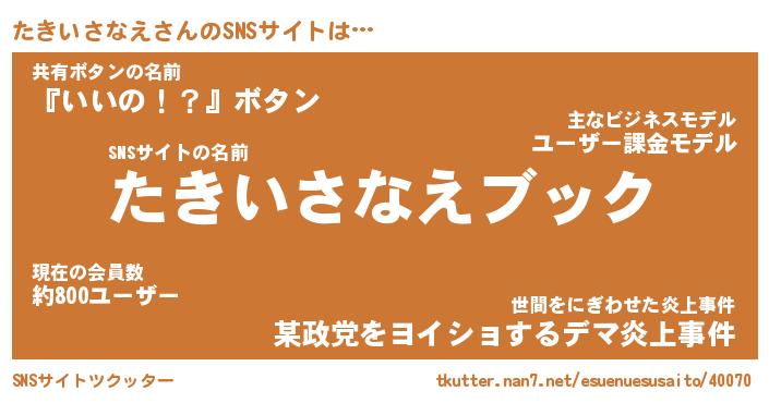 | 男性向けラノベタイトル風あだ名 | 『タキイサナエアートオンライン』 |