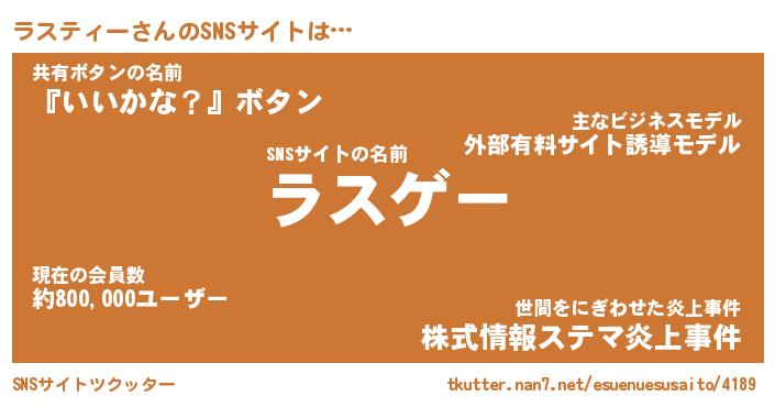 | 肩書あだ名 | 『ラスティーCEO』『ラスティー国家主席』 |