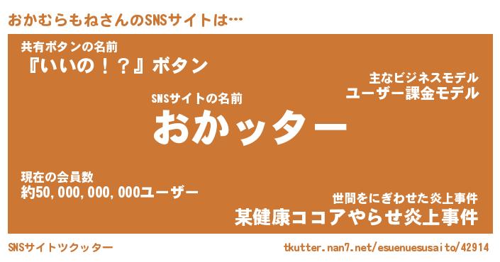 | 胡散臭い通販商品みたいなあだ名 | 『億万長者になれるブレスレット…その名も「おかむらもね」』 |