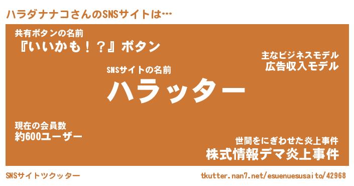 | ヒーロー風カッコイイあだ名 | 『スーパーハラダナナコ』『黄金騎士ハラ』 |