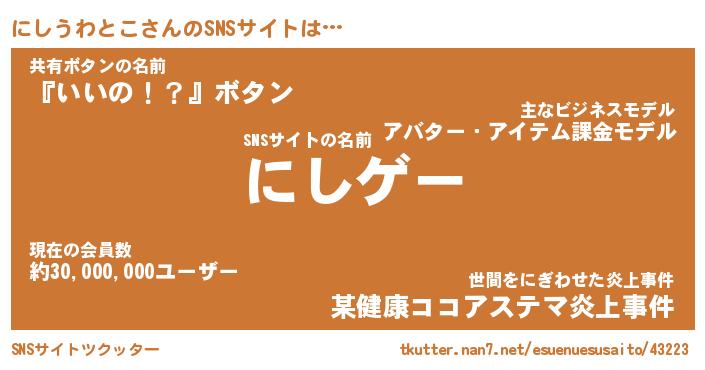 | ヘコむあだ名 | 『にしっふぃ~』『レバニラ』 |