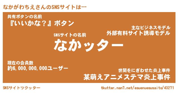| 男性向けラノベタイトル風あだ名 | 『ナカガワチエアートオンライン』 |