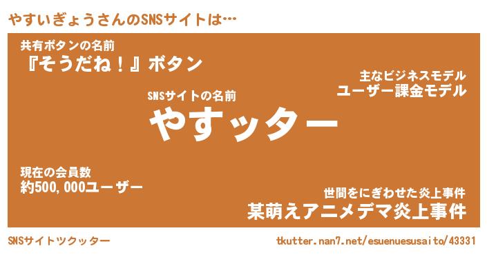 | 男性向けラノベタイトル風あだ名 | 『ヤスイギョウアートオンライン』 |