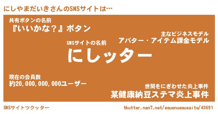 | ポケモン風あだ名 | 『ニシチュウ』『ニシヤダネ』 |