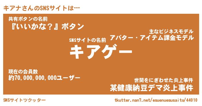 | 意味不明あだ名 | 『ペロリンキアナ』『キアナフォーエバー』 |