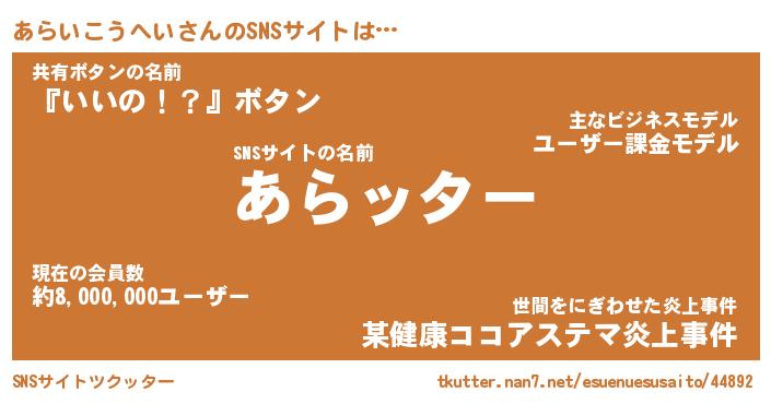 | 胡散臭い通販商品みたいなあだ名 | 『億万長者になれる霊験あらたかなお札…その名も「あらいこうへい」』 |