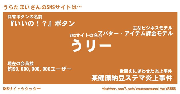 | 男性向けラノベタイトル風あだ名 | 『うらたまいの憂鬱』 |