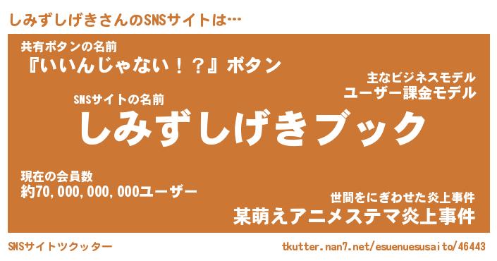 | 男性向けラノベタイトル風あだ名 | 『シミズシゲキアートオンライン』 |