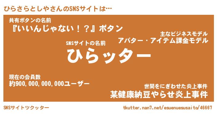 | 男性向けラノベタイトル風あだ名 | 『ヒラサラトシヤアートオンライン』 |