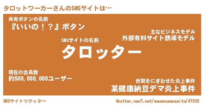 | 胡散臭い通販商品みたいなあだ名 | 『億万長者になれる霊験あらたかなお札…その名も「タロットワーカー」』 |