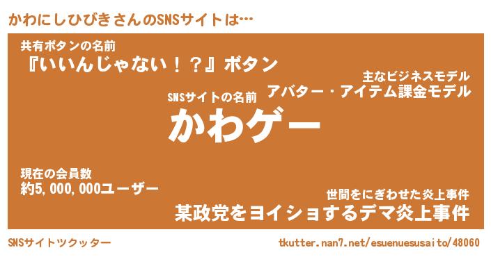 | 男性向けラノベタイトル風あだ名 | 『かわにしひびきの憂鬱』 |