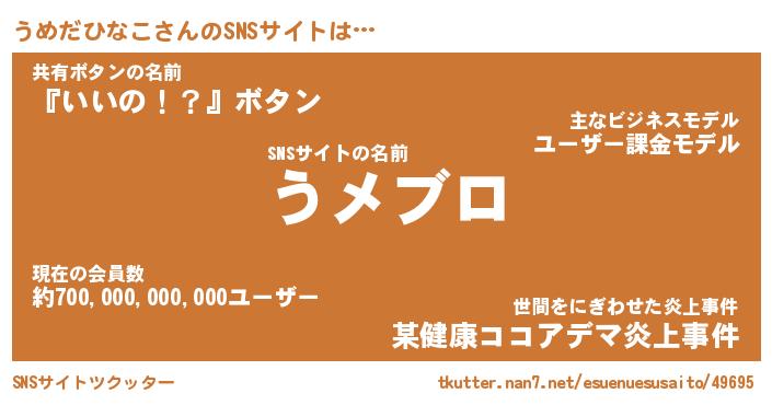 | 肩書あだ名 | 『うめだひなこCEO』『うめだひなこ大統領』 |