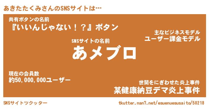 | 男性向けラノベタイトル風あだ名 | 『アキタタクミアートオンライン』 |