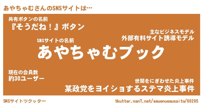 | 男性向けラノベタイトル風あだ名 | 『アヤチャムアートオンライン』 |