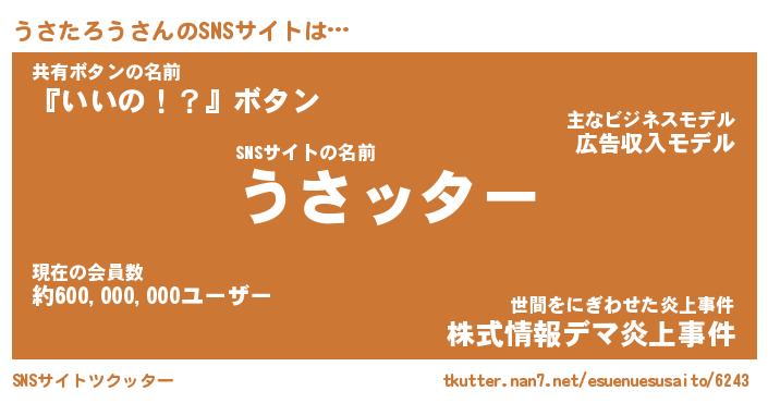 | 胡散臭い通販商品みたいなあだ名 | 『億万長者になれるブレスレット…その名も「うさたろう」』 |
