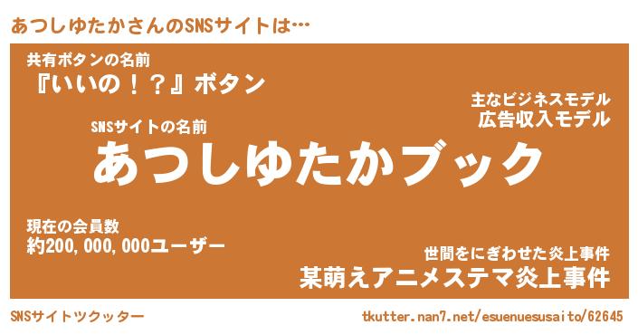 | 男性向けラノベタイトル風あだ名 | 『アツシユタカアートオンライン』 |