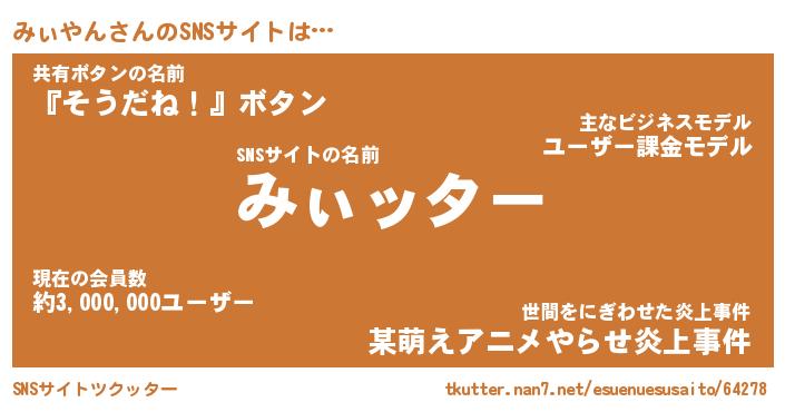 | 男性向けラノベタイトル風あだ名 | 『ミィヤンアートオンライン』 |