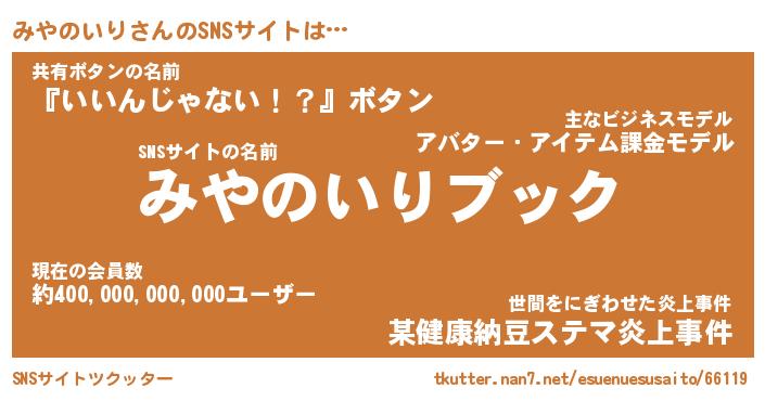 | 肩書あだ名 | 『みやのいり社長』『みやのいり総理大臣』 |
