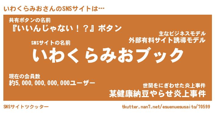 | 胡散臭い通販商品みたいなあだ名 | 『億万長者になれるブレスレット…その名も「いわくらみお」』 |