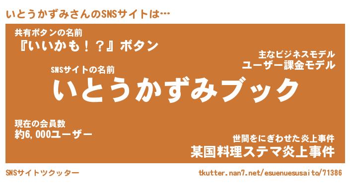 | 男性向けラノベタイトル風あだ名 | 『イトウカズミアートオンライン』 |