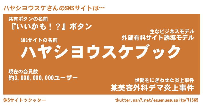 | 男性向けラノベタイトル風あだ名 | 『ハヤシヨウスケアートオンライン』 |