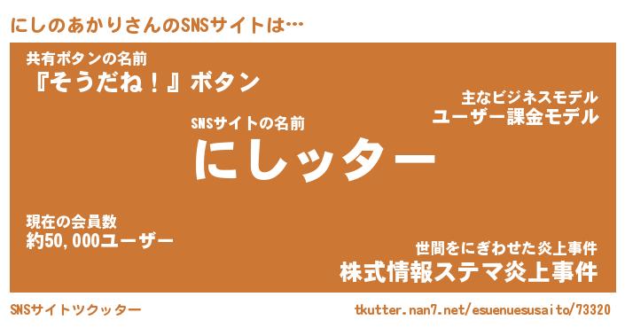 | 胡散臭い通販商品みたいなあだ名 | 『億万長者になれるブレスレット…その名も「にしのあかり」』 |
