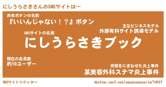 | 男性向けラノベタイトル風あだ名 | 『ニシウラサキアートオンライン』 |