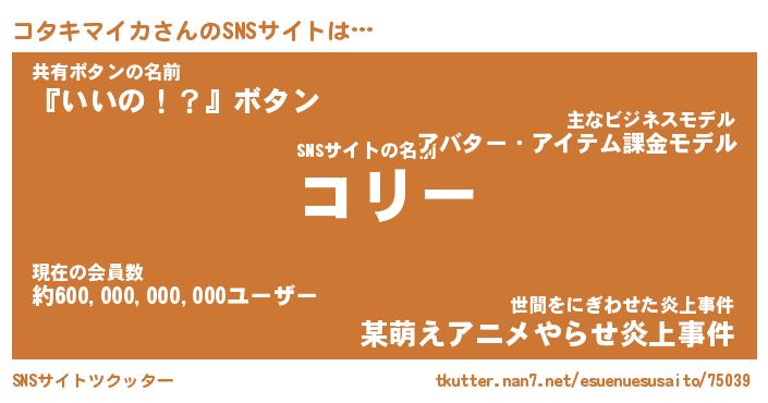 | 肩書あだ名 | 『コタキマイカCEO』『コタキマイカ班長』 |