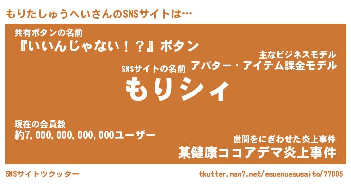 | 肩書あだ名 | 『もりたしゅうへい御曹司』 |