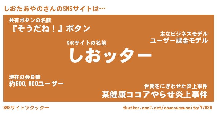 | 男性向けラノベタイトル風あだ名 | 『シオタアヤノアートオンライン』 |
