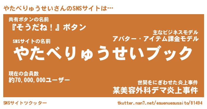 | ツイッター | やたべりゅうせいさんのツイッターID『namakemono_kun』 |
