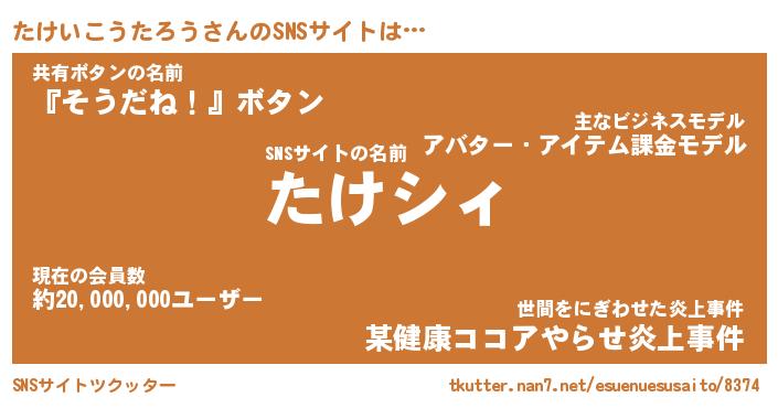 | ヘコむあだ名 | 『たけにゅー』『つくし』『たけを』 |