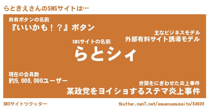 | 肩書あだ名 | 『らときえ店長』『らときえ総理大臣』 |