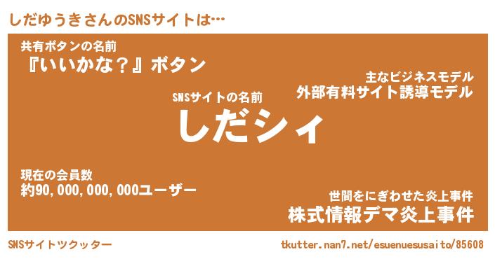 | 肩書あだ名 | 『しだゆうき社長』『しだゆうき国家主席』 |
