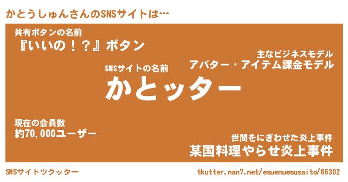 | ヒーロー風カッコイイあだ名 | 『スーパーカトウシュン』『炎刃騎士カト』 |