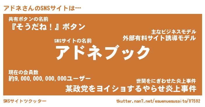 | 肩書あだ名 | 『アドネ社長』『アドネ大統領』 |