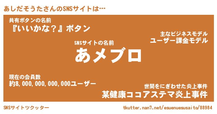 | 男性向けラノベタイトル風あだ名 | 『アシダソウタアートオンライン』 |