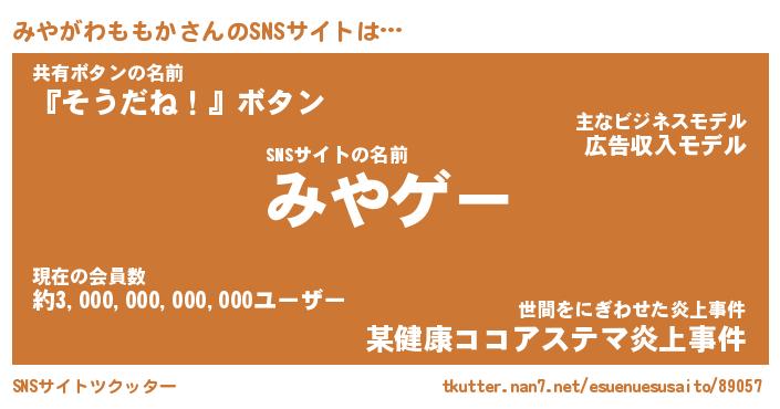 | 恥ずかしいあだ名 | 『プリティーみやがわももか』『みやちん』 |