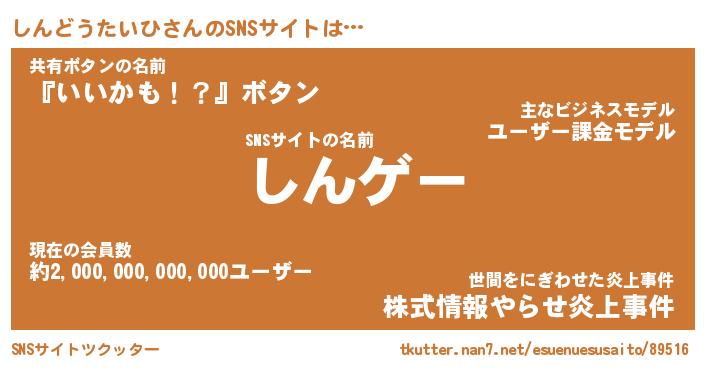 | 肩書あだ名 | 『しんどうたいひ御曹司』 |